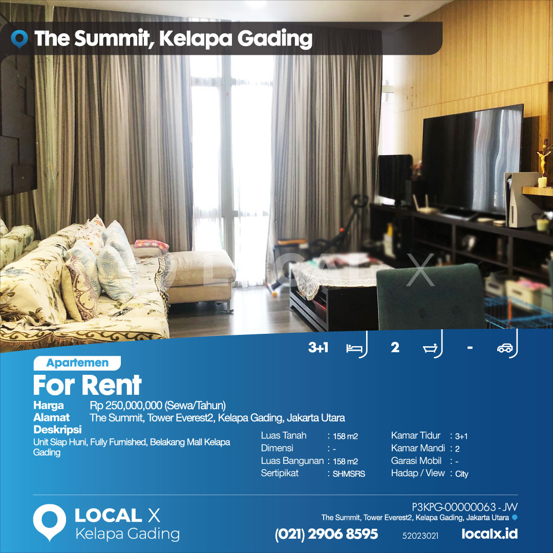P3KPG-00000063-JW-S (For Rent – Sewa) Apartemen The Summit, Tower Everest2, Kelapa Gading, Jakarta Utara