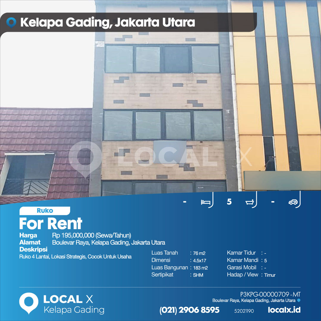 P3KPG-00000709-MT-S (For Rent – Sewa) Ruko Boulevar Raya, Kelapa Gading, Jakarta Utara