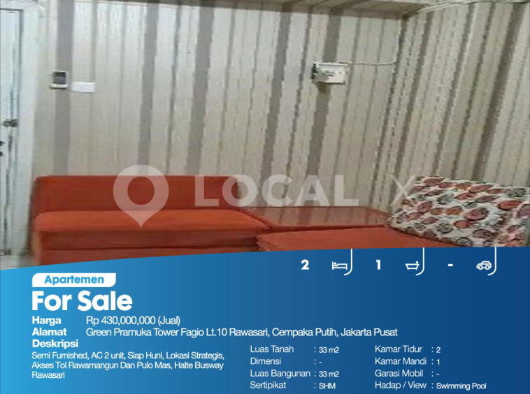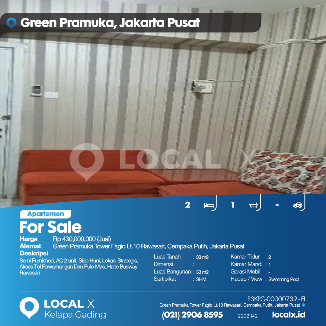 P3KPG-00000739-EI-J (For Sale – Jual) Apartemen Green Pramuka Tower Fagio Lt.10 Rawasari, Cempaka Putih, Jakarta Pusat