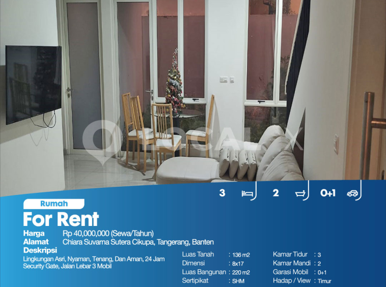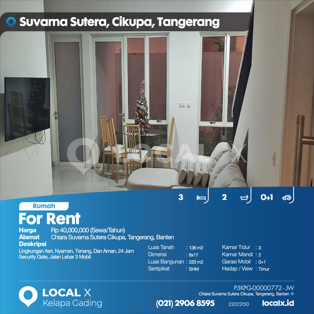 P3KPG-00000772-JW-S (For Rent – Sewa) Rumah Chiara Suvarna Sutera Cikupa, Tangerang, Banten