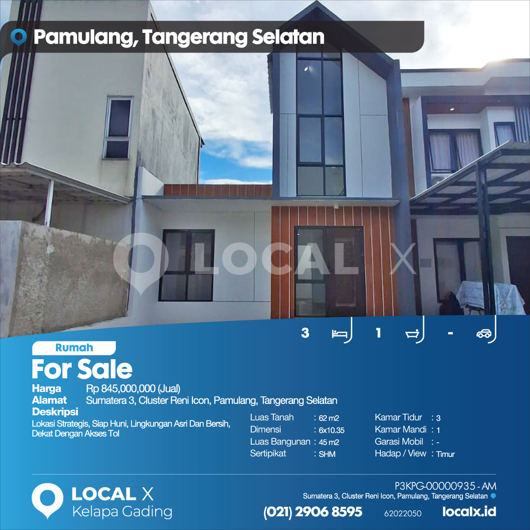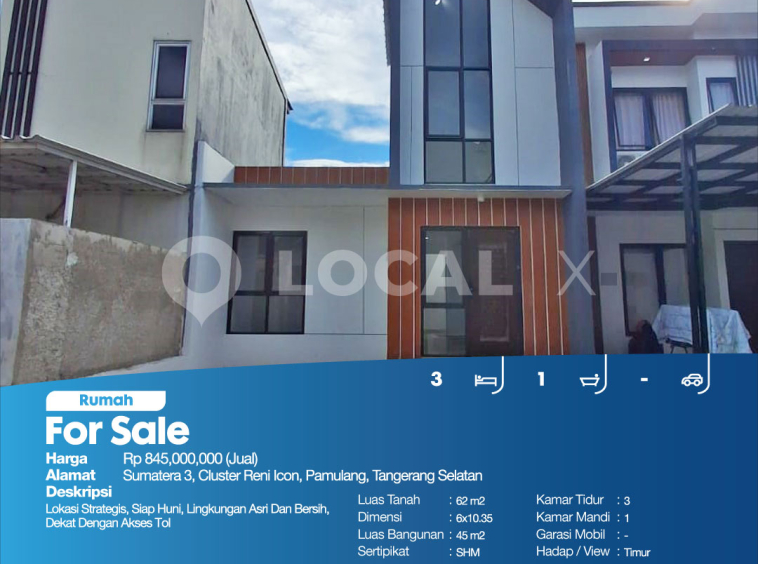 P3KPG-00000935-AM-J (For Sale – Jual) Rumah Sumatera 3, Cluster Reni Icon, Pamulang, Tangerang Selatan