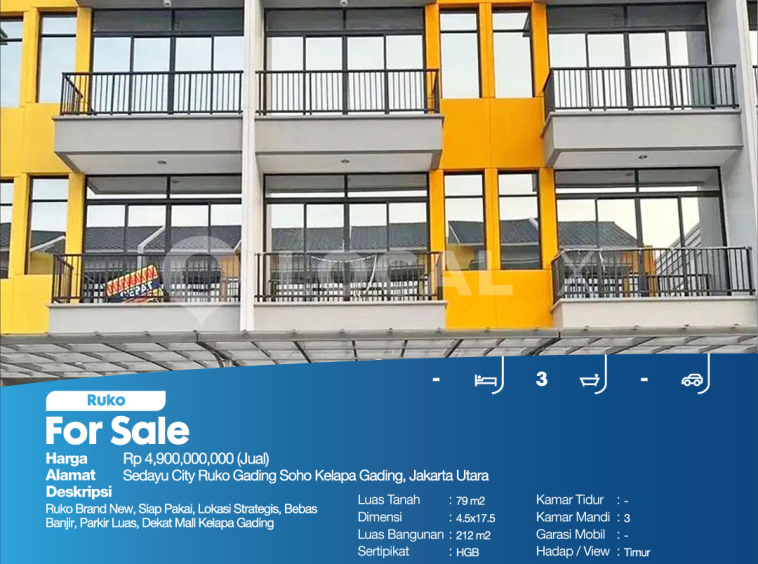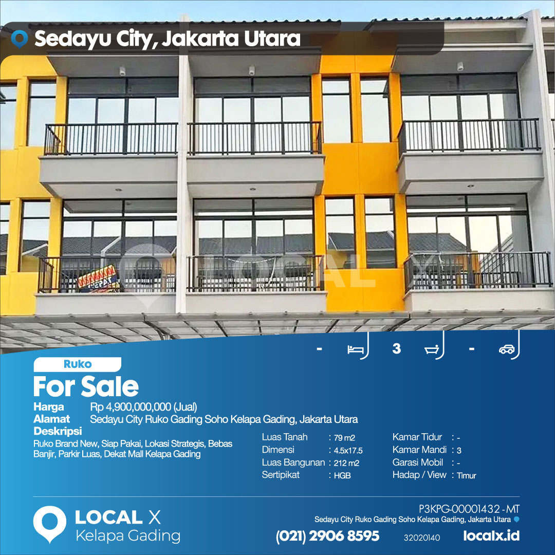 Ruko Brand New, Siap Pakai, Lokasi Strategis, Bebas Banjir, Parkir Luas, Dekat Mall Kelapa Gading