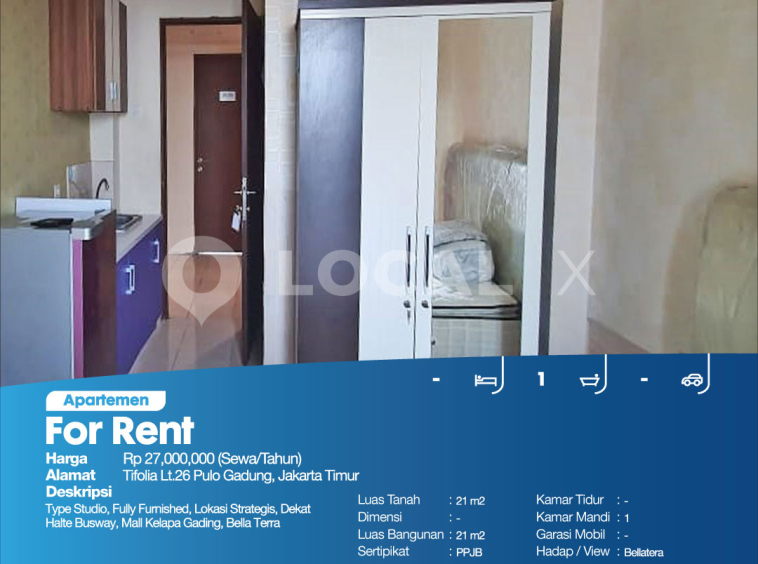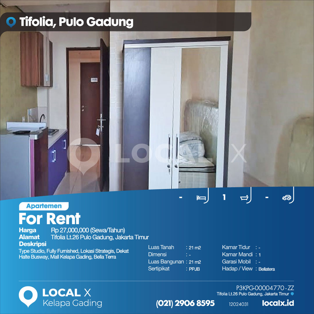 Type Studio, Fully Furnished, Lokasi Strategis, Dekat Halte Busway, Mall Kelapa Gading, Bella Terra