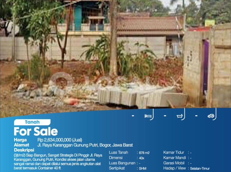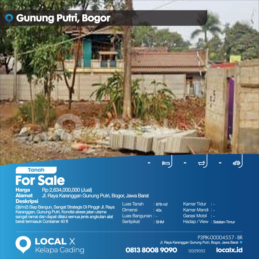 Description:(Rp3jt/m2) Siap Bangun, Sangat Strategis Di Pinggir Jl. Raya Karanggan, Gunung Putri, Kondisi akses jalan utama sangat ramai dan dapat dilalui semua jenis angkutan alat berat termasuk Container 40 ft